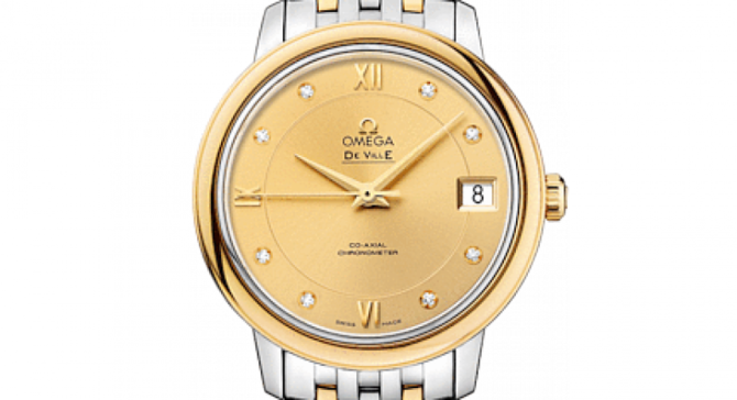 Коллекция OMEGA De Ville Prestige завоевала любовь поклонников бренда своим классическим элегантным дизайном. Входящие в нее модели отличаются чистотой линий, роскошной отделкой и вневременной эстетикой. Основу этих часов составляет коаксиальный часовой механизм, калибр 2500. Запас хода часового механизма данной модели часов 48 часов. Эффектный циферблат с окошком указателя даты в положении «3 часа» защищен устойчивым к царапинам сапфировым стеклом c антибликовым покрытием изнутри. Модель имеет впечатляющий циферблат цвета шампанского с восемью бриллиантовыми часовыми метками и римскими цифрами 6, 9 и 12. Безель из 18-каратного желтого золота закреплен на корпусе диаметром 32,7 мм из нержавеющей стали, который дополнен двухцветным браслетом из нержавеющей стали и 18-каратного желтого золота. Часы сохраняют свою водонепроницаемость на глубине до 30 метров.
