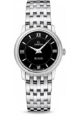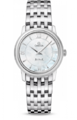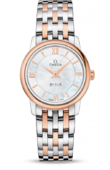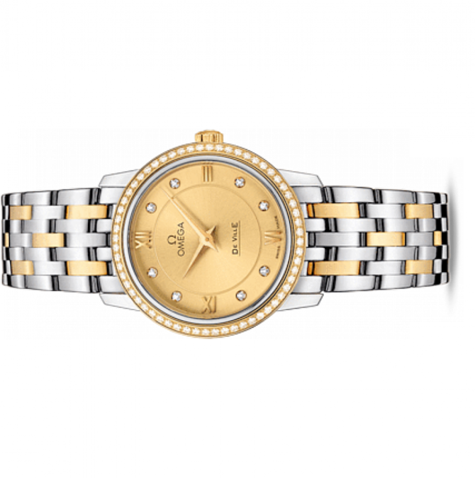 OMEGA De Ville Prestige завоевала любовь поклонников бренда своим классическим элегантным дизайном. Входящие в нее модели отличаются чистотой линий, роскошной отделкой и вневременным дизайном. Эффектный циферблат защищен устойчивым к царапинам сапфировым стеклом. Данная модель имеет циферблат цвета шампанского с делением на две зоны, с бриллиантовыми часовыми метками и выполненными из золота римскими цифрами в положениях «3 часа», «6 часов», «9 часов» и «12 часов». Корпус диаметром 27,4 мм из нержавеющей стали с браслетом из нержавеющей стали и 18-каратного желтого золота дополнен украшенным бриллиантами безелем из 18-каратного желтого золота. В этой модели используется высокоточный кварцевый механизм OMEGA, калибр 1376. Часы сохраняют свою водонепроницаемость на глубине до 30 метров. Запас хода часового механизма данной модели часов весьма внушительный - 41 месяц.
