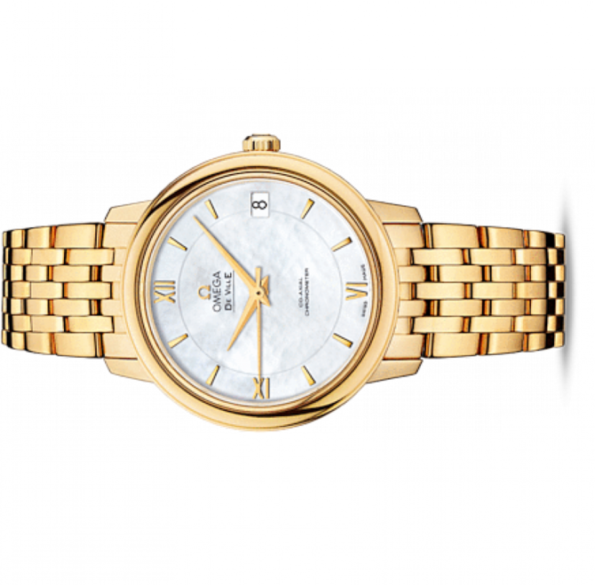 OMEGA De Ville Prestige завоевала любовь поклонников бренда своим классическим элегантным дизайном. Входящие в нее модели отличаются чистотой линий, роскошной отделкой и вневременной эстетикой. Данная модель имеет впечатляющий белый перламутровый циферблат с делением на две зоны и выполненными из золота римскими цифрами в положениях «6 часов», «9 часов» и «12 часов». Эффектный циферблат с окошком указателя даты в положении «3 часа» защищен устойчивым к царапинам сапфировым стеклом c антибликовым покрытием изнутри. Безель из 18-каратного желтого золота закреплен на корпусе диаметром 32,7 мм из того же материала, который дополнен браслетом из 18-каратного желтого золота. Основу этих часов составляет коаксиальный часовой механизм, калибр 2500. Запас хода часового механизма данной модели часов 48 часов. Часы сохраняют свою водонепроницаемость на глубине до 30 метров.