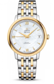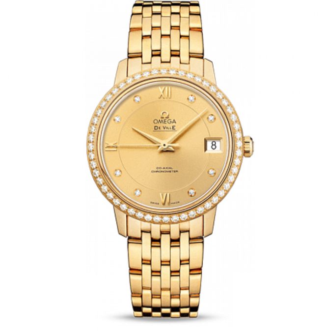 OMEGA De Ville Prestige завоевала любовь поклонников бренда своим классическим элегантным дизайном. Входящие в нее модели отличаются чистотой линий, роскошной отделкой и вневременной эстетикой. Эффектный циферблат с окошком указателя даты в положении «3 часа» защищен устойчивым к царапинам сапфировым стеклом c антибликовым покрытием изнутри. Данная модель имеет впечатляющий циферблат цвета шампанского с делением на две зоны, с восемью бриллиантовыми часовыми метками и римскими цифрами 6, 9 и 12. Украшенный бриллиантами безель из 18-каратного желтого золота закреплен на корпусе диаметром 32,7 мм из того же материала, который дополнен браслетом из 18-каратного желтого золота. Часы сохраняют свою водонепроницаемость на глубине до 30 метров. Основу этих часов составляет коаксиальный часовой механизм, калибр 2500. Запас хода часового механизма данной модели часов 48 часов.