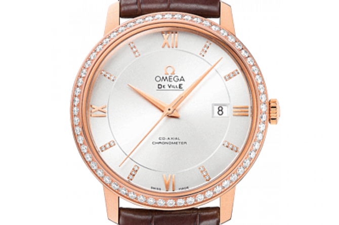 OMEGA De Ville Prestige это коллекция часов завоевала любовь поклонников бренда своим классическим элегантным дизайном. Все модели которые входят в нее отличаются чистотой классических линий, роскошной отделкой и вневременной эстетикой. Безель украшена бриллиантами и закреплен на корпусе диаметром 39,5 мм из 18-каратного розового золота с коричневым ремешком из кожи аллигатора. Основу этих часов составляет коаксиальный часовой механизм, калибр 2500. Запас хода часового механизма данной модели составляет 48 часов. Эффектный циферблат с окошком указателя даты в положении «3 часа» защищен устойчивым к царапинам сапфировым стеклом с антибликовым покрытием. Модель имеет серебристый циферблат с делением на две зоны и радиальным сатинированием. На циферблате присутствуют римские цифры 3, 6, 9 и 12 в винтажном стиле и украшены бриллиантами. Часы сохраняют свою водонепроницаемость на глубине до 30 метров.
