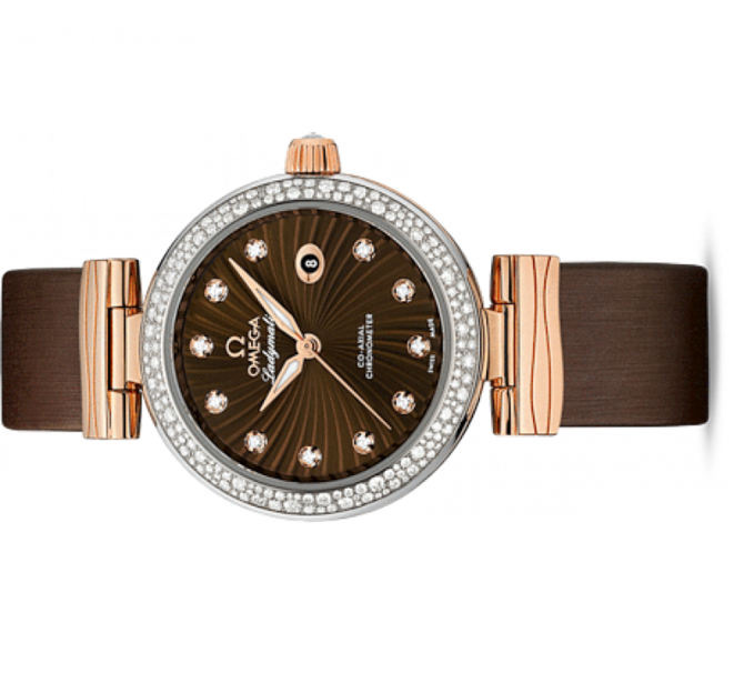 OMEGA Ladymatic являет собой притягательное сочетание неординарного дизайна и новаторского подхода к часовому искусству. Эффектный циферблат защищен устойчивым к царапинам сапфировым стеклом c двусторонним антибликовым покрытием. Эта модель имеет коричневый циферблат с бриллиантовыми часовыми метками, узором Supernova. Окошко указателя даты находится в положении «3 часа». Украшенный разноразмерными бриллиантами безель закреплен на корпусе диаметром 34 мм из нержавеющей стали, который дополнен коричневым кожаным ремешком. Торец корпуса украшен кольцом с волнистым рельефным узором и коричневой керамической вставкой. Прозрачная задняя крышка позволяет в деталях рассмотреть сердце часов - коаксиальный калибр OMEGA 8520 с родиевым покрытием. Также часы водонепроницаемы и могут выдержать давление на глубине до 100 метров. Запас хода часового механизма данной модели составляет 50 часов.