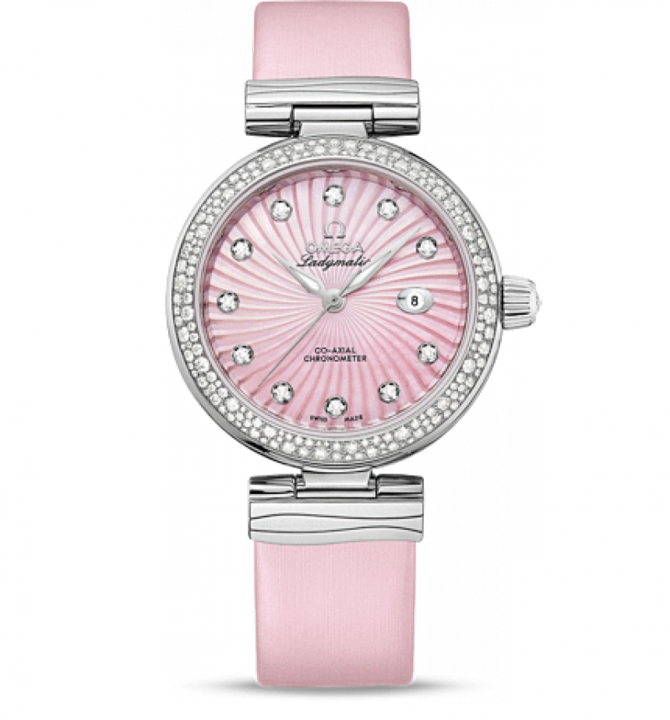 OMEGA Ladymatic разработана специально для представительниц прекрасного пола, которые выбирают себе часы не только по внешнему виду, но и по их техническим характеристикам. Изысканный циферблат защищен устойчивым к царапинам сапфировым стеклом c двусторонним антибликовым покрытием. Корпус диаметром 34 мм из нержавеющей стали с кожаным ремешком розового цвета и дополнен элегантным безелем с бриллиантами. Кольцо из нержавеющей стали с волнистым узором и внутренней вставкой из белой керамики украшает боковую сторону корпуса. Прозрачная задняя крышка позволяет в деталях рассмотреть коаксиальный калибр OMEGA 8520. Данная модель имеет розовый перламутровый циферблат с бриллиантовыми часовыми метками, звездным узором и окошком указателя даты в положении «3 часа». Также часы водонепроницаемы и могут выдержать давление на глубине до 100 метров. Запас хода часового механизма данной модели составляет 50 часов.