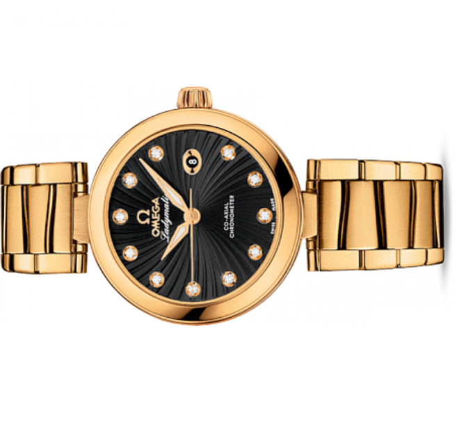OMEGA Ladymatic разработана специально для представительниц прекрасного пола, которые выбирают себе часы не только по внешнему виду, но и по их техническим характеристикам. Корпус из 18-каратного желтого золота диаметром 34 мм с браслетом из 18-каратного желтого золота дополнен элегантным безелем. Кольцо из золота с волнистым узором и внутренней вставкой из черной керамики украшает боковую сторону корпуса. Циферблат защищен устойчивым к царапинам сапфировым стеклом с двусторонним антибликовым покрытием. Данная модель OMEGA Ladymatic имеет черный циферблат с бриллиантовыми часовыми метками, звездным узором и окошком указателя даты в положении «3 часа». Прозрачная задняя крышка позволяет в деталях рассмотреть коаксиальный калибр OMEGA 8521. Запас хода часового механизма данной модели составляет 50 часов. Также часы водонепроницаемы и могут выдержать давление на глубине до 100 метров.