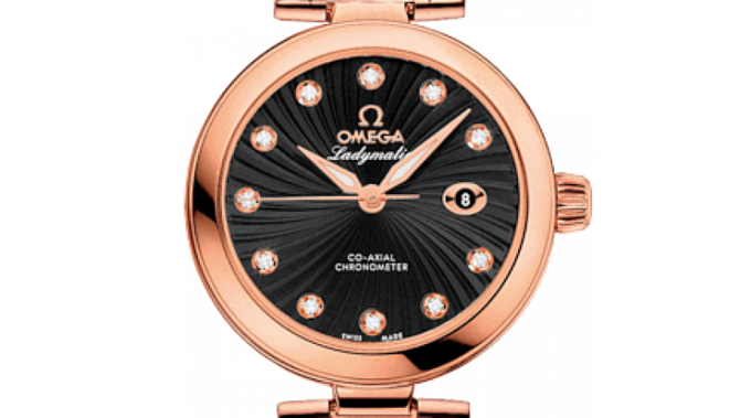 OMEGA Ladymatic разработана специально для представительниц прекрасного пола, которые выбирают себе часы не только по внешнему виду, но и по их техническим характеристикам. Линия этой модели являет собой притягательное сочетание неординарного дизайна и новаторского часового искусства. Циферблат защищен устойчивым к царапинам сапфировым стеклом с двусторонним антибликовым покрытием. Данная модель OMEGA Ladymatic имеет черный циферблат с бриллиантовыми часовыми метками, звездным узором и окошком указателя даты в положении «3 часа». Корпус из 18-каратного красного золота диаметром 34 мм с черным ремешком из кожи аллигатора дополнен элегантным безелем. Кольцо из золота с волнистым узором и внутренней вставкой из черной керамики украшает боковую сторону корпуса. Прозрачная задняя крышка позволяет в деталях рассмотреть коаксиальный калибр OMEGA 8521. Запас хода часового механизма данной модели составляет 50 часов. Также часы водонепроницаемы и могут выдержать давление на глубине до 100 метров.