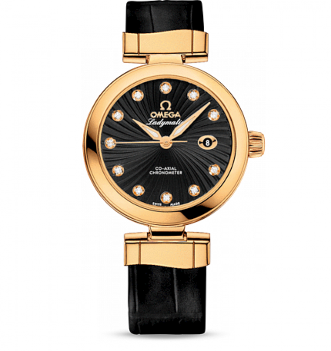 Часы OMEGA Ladymatic разработаны специально для представительниц прекрасного пола, которые выбирают себе часы не только по внешнему виду, но и по их техническим характеристикам. Линия этой модели являет собой притягательное сочетание неординарного дизайна и новаторского часового искусства. Эффектный циферблат защищен устойчивым к царапинам сапфировым стеклом с двусторонним антибликовым покрытием. Данная модель OMEGA Ladymatic имеет черный циферблат с бриллиантовыми часовыми метками, звездным узором и окошком указателя даты в положении «3 часа». Кольцо из золота с волнистым узором и внутренней вставкой из черной керамики украшает боковую сторону корпуса. Корпус из 18-каратного желтого золота диаметром 34 мм с черным ремешком из кожи аллигатора дополнен элегантным безелем. Прозрачная задняя крышка позволяет в деталях рассмотреть коаксиальный калибр OMEGA 8521. Запас хода часового механизма данной модели составляет 50 часов. Также часы водонепроницаемы и могут выдержать давление на глубине до 100 метров.