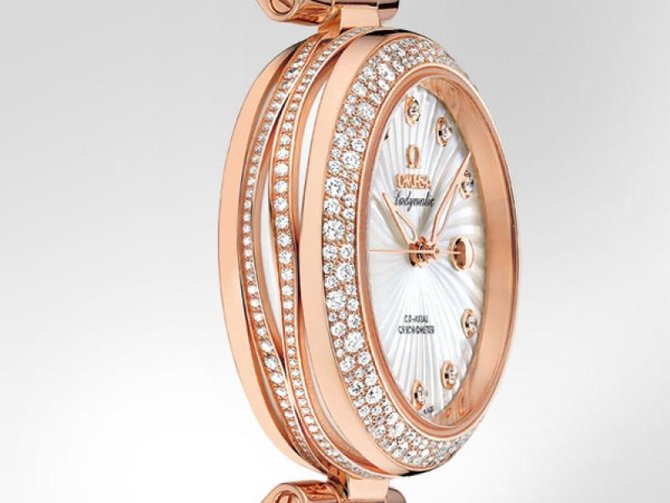 OMEGA Ladymatic являет собой притягательное сочетание неординарного дизайна и новаторского подхода к часовому искусству. Она разработана специально для представительниц прекрасного пола, которые выбирают себе часы не только по внешнему виду, но и по их техническим характеристикам. Данная модель имеет белый перламутровый циферблат с бриллиантовыми часовыми метками, звездным узором и окошком указателя даты в положении «3 часа». Изысканный циферблат защищен устойчивым к царапинам сапфировым стеклом c двусторонним антибликовым покрытием. Корпус из 18-каратного розового золота диаметром 34 мм с браслетом из 18-каратного розового золота дополнен элегантным безелем. Безель и звенья браслета украшены образующими снежный узор бриллиантами. Украшенное бриллиантами кольцо из золота с волнистым узором и внутренней вставкой из белой керамики украшает боковую сторону корпуса. Прозрачная задняя крышка позволяет в деталях рассмотреть коаксиальный калибр OMEGA 8521. Запас хода часового механизма данной модели составляет 50 часов. Также часы водонепроницаемы и могут выдержать давление на глубине до 100 метров.