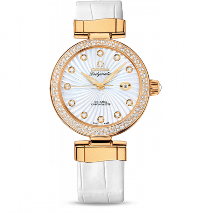 OMEGA Ladymatic являет собой притягательное сочетание неординарного дизайна и новаторского часового искусства. Корпус из 18-каратного желтого золота диаметром 34 мм с белым кожаным ремешком дополнен безелем, украшенным образующими снежный узор бриллиантами. Кольцо из золота с волнистым узором и внутренней вставкой из белой керамики украшает боковую сторону корпуса. Прозрачная задняя крышка позволяет в деталях рассмотреть коаксиальный калибр OMEGA 8521. Запас хода часового механизма данной модели составляет 50 часов. Данная модель OMEGA Ladymatic имеет белый перламутровый циферблат с бриллиантовыми часовыми метками, звездным узором и окошком указателя даты в положении «3 часа». Изысканный циферблат защищен устойчивым к царапинам сапфировым стеклом с двусторонним антибликовым покрытием. Также часы водонепроницаемы и могут выдержать давление на глубине до 100 метров.