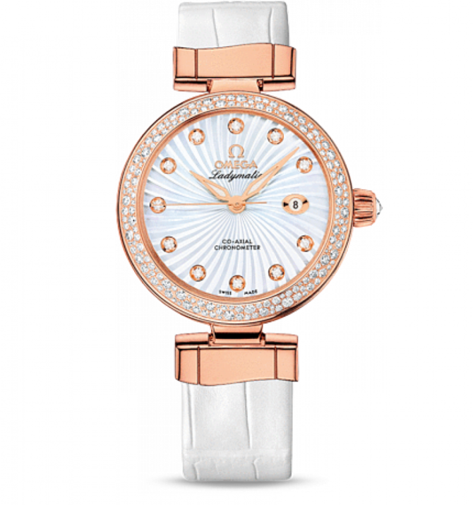 OMEGA Ladymatic являет собой притягательное сочетание неординарного дизайна и новаторского часового искусства. Она разработана специально для представительниц прекрасного пола, которые выбирают себе часы не только по внешнему виду, но и по их техническим характеристикам. Данная модель OMEGA Ladymatic имеет белый перламутровый циферблат с бриллиантовыми часовыми метками, звездным узором и окошком указателя даты в положении «3 часа». Изысканный циферблат защищен устойчивым к царапинам сапфировым стеклом с двусторонним антибликовым покрытием. Корпус из 18-каратного красного золота диаметром 34 мм с белым кожаным ремешком дополнен безелем, украшенным образующими снежный узор бриллиантами. Кольцо из золота с волнистым узором и внутренней вставкой из белой керамики украшает боковую сторону корпуса. Прозрачная задняя крышка позволяет в деталях рассмотреть коаксиальный калибр OMEGA 8521. Запас хода часового механизма данной модели составляет 50 часов. Также часы водонепроницаемы и могут выдержать давление на глубине до 100 метров.