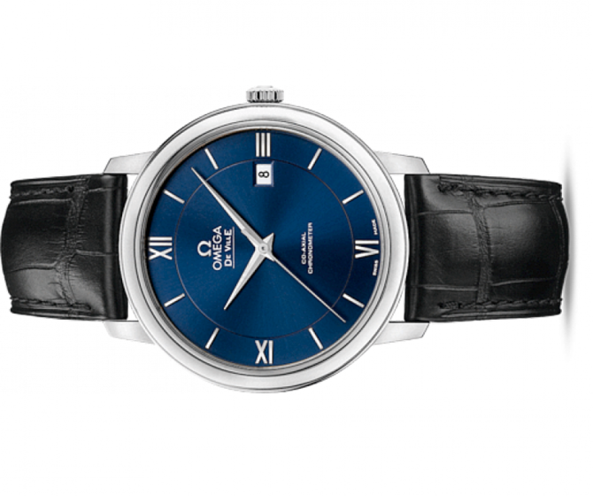 OMEGA De Ville Prestige завоевала любовь поклонников бренда своим классическим элегантным дизайном. Входящие в нее модели отличаются чистотой классических линий, роскошной отделкой и вневременной эстетикой. Модель имеет выразительный циферблат синего цвета с делением на две зоны и радиальным сатинированием. На циферблате присутствуют римские цифры 3, 6, 9 и 12 в винтажном стиле. Эффектный циферблат с окошком указателя даты в положении «3 часа» защищен устойчивым к царапинам сапфировым стеклом с антибликовым покрытием знутри. Безель закреплен на корпусе диаметром 39,5 мм из нержавеющей стали с черным кожаным ремешком. Основу этих часов составляет коаксиальный часовой механизм, калибр 2500. Запас хода часового механизма данной модели составляет 48 часов. Часы сохраняют свою водонепроницаемость на глубине до 30 метров.