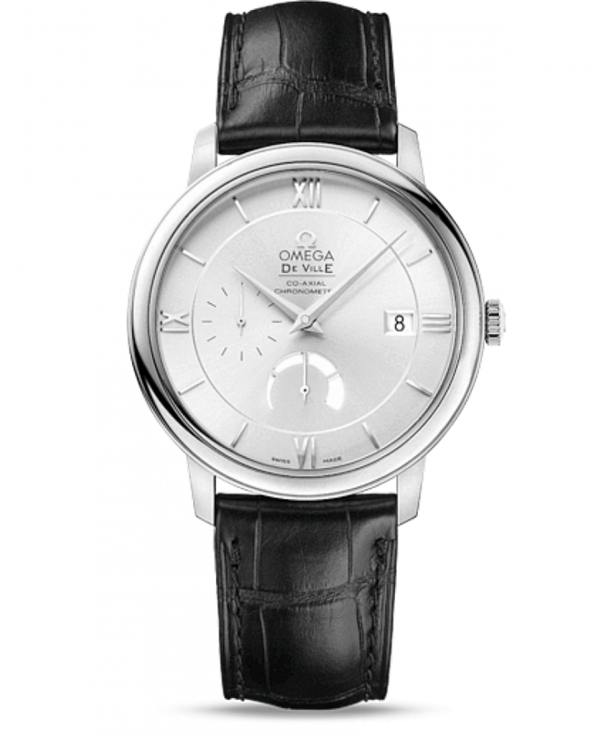 OMEGA De Ville Prestige завоевала любовь поклонников бренда своим классическим элегантным дизайном. Входящие в нее модели отличаются чистотой классических линий, роскошной отделкой и вневременной эстетикой. Данная модель имеет циферблат серебристого цвета с делением на две зоны и радиальным сатинированием. На циферблате присутствуют римские цифры 3, 6, 9 и 12 в винтажном стиле. Эффектный циферблат имеет окошко указателя даты, индикатор запаса хода, малую секундную стрелку и защищен выпуклым,устойчивым к царапинам сапфировым стеклом с антибликовым покрытием изнутри. Основу этих часов составляет коаксиальный часовой механизм, калибр 2627. Запас хода часового механизма составляет 48 часов. Безель закреплен на корпусе диаметром 39,5 мм из нержавеющей стали с черным кожаным ремешком. Часы герметичны и сохраняют свою водонепроницаемость на глубине до 30 метров.