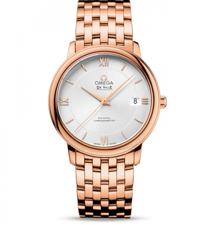 Коллекция часов OMEGA De Ville Prestige завоевала любовь поклонников бренда своим классическим элегантным дизайном. Входящие в нее модели отличаются чистотой классических линий, роскошной отделкой и вневременной эстетикой. Модель имеет выразительный циферблат серебристого цвета с делением на две зоны и радиальным сатинированием. На циферблате присутствуют римские цифры 3, 6, 9 и 12 в винтажном стиле. Эффектный циферблат с окошком указателя даты в положении «3 часа» защищен устойчивым к царапинам сапфировым стеклом c антибликовым покрытием изнутри. Безель закреплен на корпусе диаметром 36,8 мм из 18-каратного розового золота с браслетом из 18-каратного розового золота. Основу этих часов составляет коаксиальный часовой механизм, калибр 2500. Запас хода часового механизма данной модели - 48 часов. Часы сохраняют свою водонепроницаемость на глубине до 30 метров.