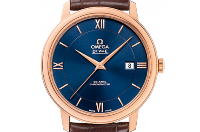 Коллекция часов OMEGA De Ville Prestige завоевала любовь поклонников бренда своим классическим элегантным дизайном. Входящие в нее модели отличаются чистотой классических линий, роскошной отделкой и вневременной эстетикой. Эффектный циферблат с окошком указателя даты в положении «3 часа» защищен устойчивым к царапинам сапфировым стеклом с антибликовым покрытием. Данная модель имеет выразительный циферблат синего цвета с делением на две зоны и радиальным сатинированием. На циферблате присутствуют римские цифры 3, 6, 9 и 12 в винтажном стиле. Безель закреплен на корпусе диаметром 39,5 мм из 18-каратного розового золота с коричневым кожаным ремешком. Основу этих часов составляет коаксиальный часовой механизм, калибр 2500. Запас хода часового механизма данной модели составляет 48 часов. Часы сохраняют свою водонепроницаемость на глубине до 30 метров.