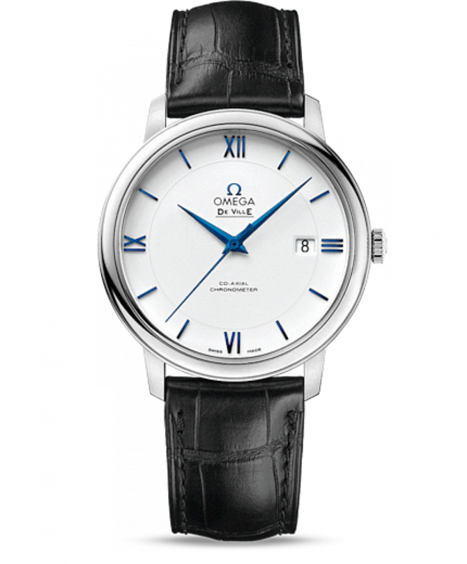 Коллекция OMEGA De Ville Prestige завоевала любовь поклонников бренда своим классическим элегантным дизайном. Входящие в нее модели отличаются чистотой линий, роскошной отделкой и вневременным дизайном. Данная модель имеет белый циферблат с делением на две зоны, с окошком указателя даты в положении «3 часа». Часовые метки и центральные часовая, минутная и секундная стрелки имеют синее PVD-покрытие. Эффектный циферблат защищен устойчивым к царапинам сапфировым стеклом с антибликовым покрытием изнутри. Корпус диаметром 39,5 мм из 18-каратного белого золота с черным кожаным ремешком дополнен элегантным безелем. Основу этой модели составляет коаксиальный калибр 2500. Запас хода часового механизма данной модели составляет 48 часов. Часы сохраняют свою водонепроницаемость на глубине до 30 метров.