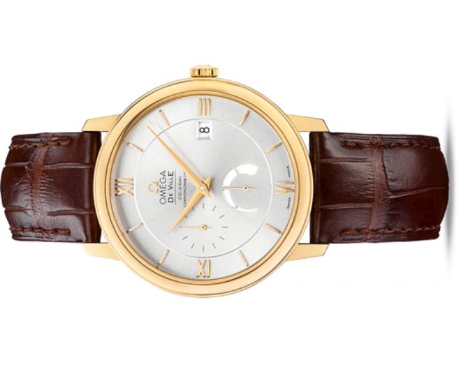 Коллекция OMEGA De Ville Prestige завоевала любовь поклонников бренда своим классическим элегантным дизайном. Входящие в нее модели отличаются чистотой линий, роскошной отделкой и вневременным дизайном. Корпус диаметром 39,5 мм из 18-каратного желтого золота с коричневым кожаным ремешком дополнен элегантным безелем. В этой модели используется коаксиальный часовой механизм, калибр 2627. Запас хода часового механизма составляет 48 часов. Данная модель имеет серебристый циферблат с делением на две зоны и римскими цифрами из 18-желтого золота. Эффектный циферблат с окошком указателя даты, указателем запаса хода и отдельным индикатором малой секундной стрелки защищен устойчивым к царапинам сапфировым стеклом c антибликовым покрытием. Часы герметичны и сохраняют свою водонепроницаемость на глубине до 30 метров.
