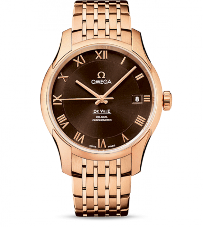 Все модели элегантной серии OMEGA De Ville характеризуется оригинальным классическим дизайном. Корпус диаметром 41 мм из 18-каратного красного золота с браслетом из того же материала дополнен элегантным безелем. В этой изысканной модели используется коаксиальный механизм OMEGA, калибр 8501, который хорошо виден сквозь прозрачную заднюю крышку. Запас хода часового механизма данной модели составляет 60 часов. Часы водонепроницаемы и способны выдерживать давление на глубине до 100 метров. Эффектный циферблат с окошком указателя даты в положении «3 часа» защищен устойчивым к царапинам сапфировым стеклом с двусторонним антибликовым покрытием. Данная модель имеет коричневый циферблат с делением на две зоны и часовые метки исполнены римскими цифрами из 18-каратного золота.
