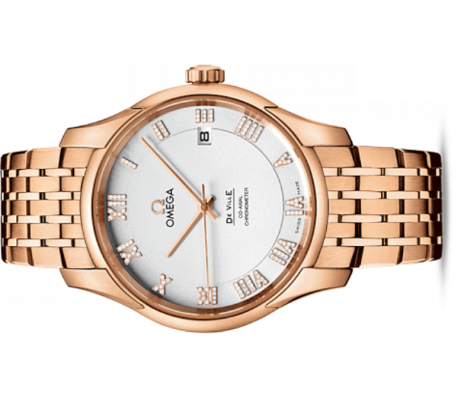 Модели элегантной серии OMEGA De Ville характеризуется оригинальным классическим дизайном. Эффектный циферблат с окошком указателя даты в положении «3 часа» защищен устойчивым к царапинам сапфировым стеклом с двусторонним антибликовым покрытием. Данная модель имеет серебристый циферблат с делением на две зоны и украшенными бриллиантами римскими цифрами из 18-каратного золота. В этой изысканной модели используется коаксиальный механизм OMEGA, калибр 8501, который хорошо виден сквозь прозрачную заднюю крышку. Запас хода часового механизма данной модели составляет 60 часов. Корпус диаметром 41 мм из 18-каратного красного золота с браслетом из того же материала дополнен элегантным безелем. Часы водонепроницаемы и способны выдерживать давление на глубине до 100 метров.