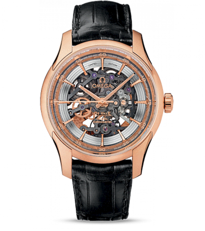 Линия OMEGA De Ville Hour Vision, запущенная в 2007 году, пополнилась двумя скелетонизированными моделями, выпущенными ограниченной серией. Четырехслойное сапфировое стекло с двусторонним антибликовым покрытием дает возможность оценить всю сложность часового механизма. Эта модель из 18-каратного розового золота с циферблатом из сапфирового стекла с надписями и метками из 18-каратного розового золота дополнена рифленой часовой шкалой с родиевым покрытием и надписью «Limited Edition». В этой изысканной модели используется коаксиальный механизм OMEGA, калибр 8402, со скелетонизированным ротором из 18-каратного розового золота и платиной из сапфирового стекла, на которой 18-каратным розовым золотом нанесены номера калибра и ограниченной серии. Модель дополнена черным кожаным ремешком. Данный сертифицированный хронометр, выпущенный ограниченной серией из 88 экземпляров, предлагается только в бутиках OMEGA. Запас хода часового механизма составляет 60 часов. Часы сохраняют свою водонепроницаемость на глубине до 100 метров.