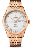Каждая из моделей элегантной серии OMEGA De Ville характеризуется оригинальным классическим дизайном. Эффектный циферблат защищен устойчивым к царапинам сапфировым стеклом с двусторонним антибликовым покрытием. Данная модель имеет серебристый циферблат с делением на две зоны, римскими цифрами из 18-каратного золота и окошками указателей даты и месяца в положении «3 часа». Корпус диаметром 41 мм из 18-каратного красного золота с коричневым ремешком из кожи аллигатора дополнен элегантным безелем. В этой изысканной модели используется коаксиальный механизм OMEGA, калибр 8611, который хорошо виден сквозь прозрачную заднюю крышку. Запас хода часового механизма этой модели составляет 55 часов. Часы герметичны и сохраняют свою водонепроницаемость на глубине до 100 метров.