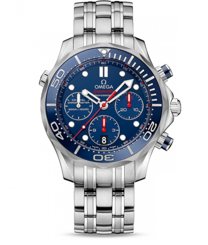 Этот превосходный образец нашего часового мастерства отражает богатый опыт OMEGA в производстве дайверских часов и свойственный бренду дух новаторства. Оригинальный циферблат накрыт выпуклым, устойчивым к царапинам сапфировым стеклом с двусторонним антибликовым порытием. Данная модель OMEGA Seamaster Diver 300M Chronograph имеет лакированный синий циферблат с 30-минутным счетчиком в положении «3 часа», 12-часовым счетчиком в положении «6 часов» и малой секундной стрелкой в положении «9 часов». Вращающийся в одном направлении синий безель из полированнойсиней керамики закреплен на корпусе диаметром 41.5 мм из нержавеющей стали с гелиевым клапаном и интегрированным корректором даты в положении «10 часов». Часы дополняет браслет из нержавеющей стали. Хронограф оснащен коаксиальным часовым механизмом OMEGA, калибром 3330. Часы сохраняют свою водонепроницаемость на глубине до 300 метров. Запас хода механизма - 52 часа.