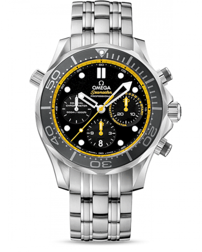 Этот превосходный образец нашего часового мастерства отражает богатый опыт OMEGA в производстве дайверских часов и свойственный бренду дух новаторства. Часы OMEGA Seamaster Diver 300M Regatta имеют черный циферблат с желтой пятиминутной шкалой обратного отсчета на 30-минутном счетчике в положении «3 часа», с 12-часовым счетчиком в положении «6 часов» и малой секундной стрелкой в положении «9 часов». Вращающийся в одном направлении безель из матовой черной керамики закреплен на корпусе диаметром 44 мм из нержавеющей стали с гелиевым клапаном и встроенным корректором даты в положении «10 часов». Часы дополняет браслет из нержавеющей стали. Хронограф оснащен коаксиальным часовым механизмом OMEGA, калибром 3330. Часы сохраняют свою водонепроницаемость на глубине до 300 метров. Запас хода механизма - 52 часа.