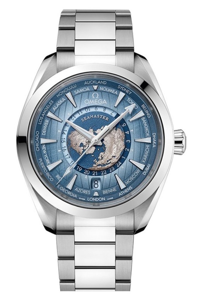 Швейцарские наручные часы Seamaster Aqua Terra 150 m GMT Worldtimer 43 mm 220.10.43.22.03.002 представлены часовой маркой Omega в 2023 году. Часы оснащены высокой герметичностью - 150 метров. Мануфактурный автоматический калибр Omega 8938 имеет статус хронометра, запас хода на 60 часов работы, функцию второго времени, индикаторы день/ночь и даты. Корпус, диаметром 43 мм, выполен из нержавеющей стали. Сквозь стекло из сапфирового кристалла показываются данные текущего времени, времени 24 часовых поясов, день/ночь и текущая дата. Стальной браслет укомплектован раскладной стальной застежкой. Часовые метки и стрелки покрыты люминесцентным составом, обеспечивающим считывание показаний в темноте. Задняя крышка с уникальным гильошированием.