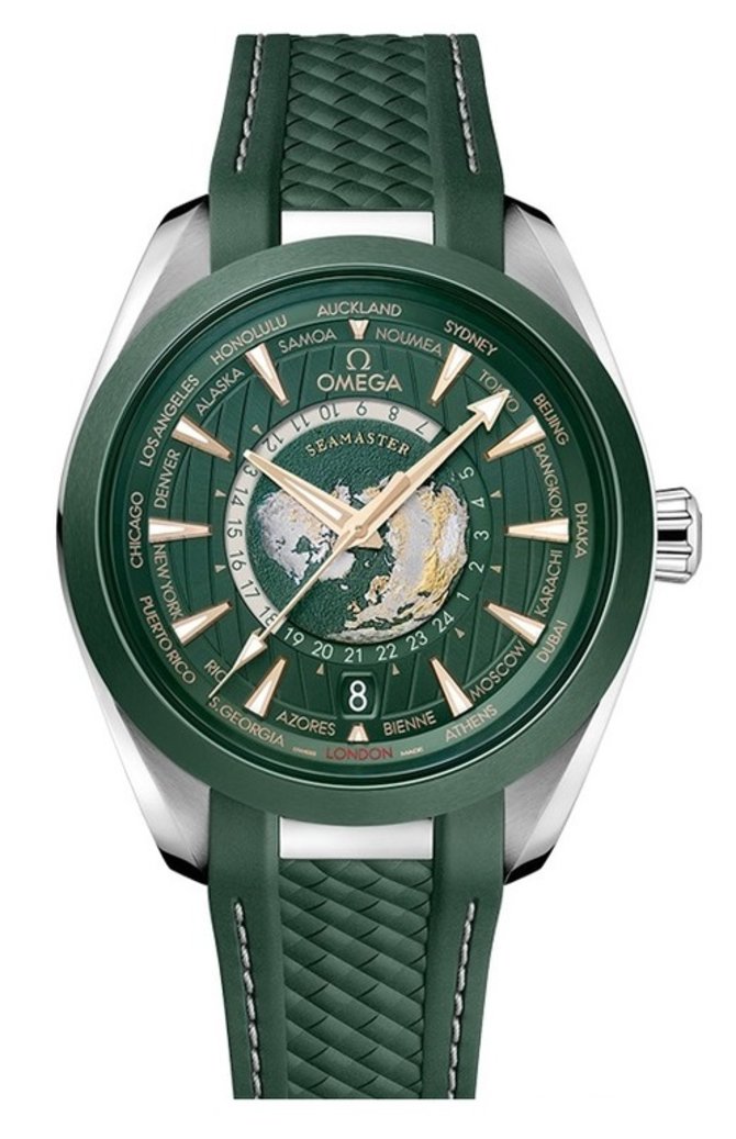 Швейцарские наручные часы Seamaster Aqua Terra 150 m GMT Worldtimer 43 mm 220.30.43.22.10.001 представлены часовой маркой Omega в 2023 году. Часы оснащены высокой герметичностью - 150 метров. Мануфактурный автоматический калибр Omega 8938 имеет статус хронометра, запас хода на 60 часов работы, функцию второго времени, индикаторы день/ночь и даты. Корпус, диаметром 43 мм, выполен из нержавеющей стали. Сквозь стекло из сапфирового кристалла показываются данные текущего времени, времени 24 часовых поясов, день/ночь и текущая дата. Стальной браслет оснащен раскладной застежкой. Часовые метки и стрелки покрыты люминесцентным составом, обеспечивающим считывание показаний в темноте. Прозрачная задняя крышка из сапфирового кристалла показывает работу установленного механизма.