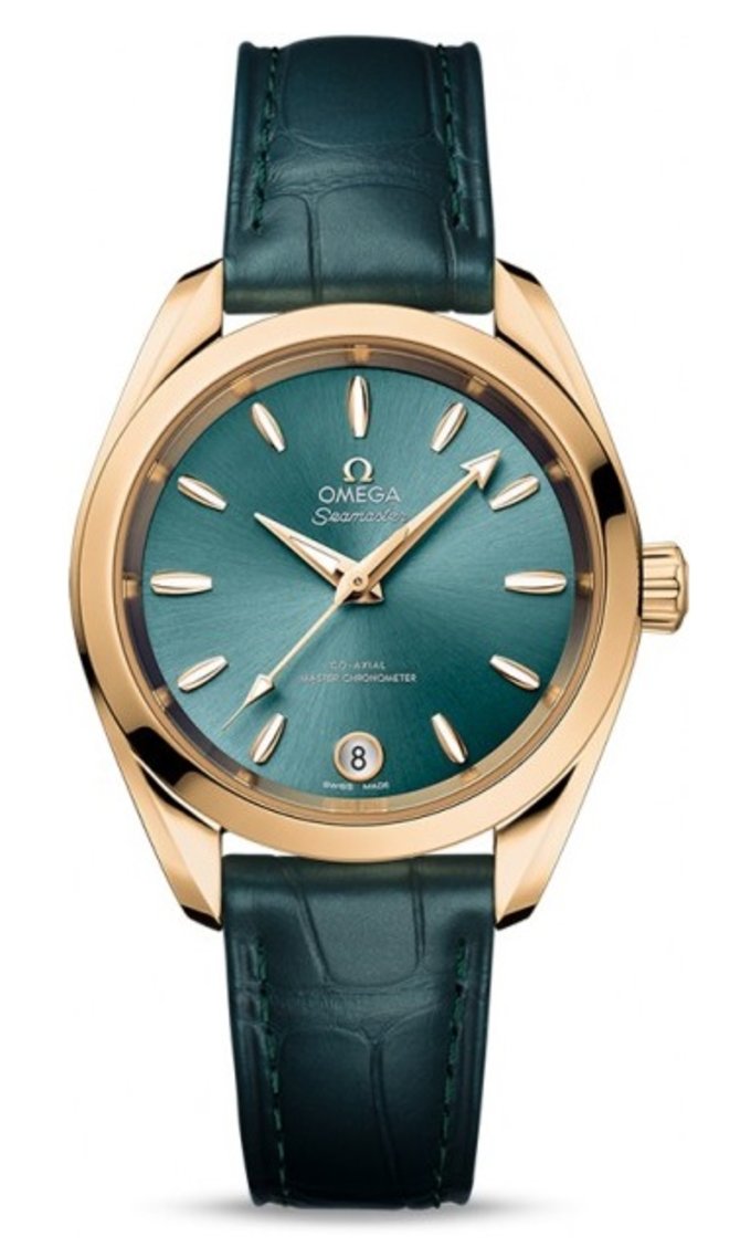 Часовая мануфактура Omega представляет женские наручные часы Seamaster Aqua Terra 150 m Chronometer 34 mm 220.53.34.20.10.001 из розового золота. Сквозь сапфировую заднюю крышку часов можно увидеть работу автоматического механизма Omega 8800 с запасом хода 55 часов. На циферблате с золотыми часовыми метками и стрелками с люминесцентным составом отображаются данные текущего времени. Защитное стекло циферблата выполнено из сапфирового кристалла. Индикатор даты расположен внизу циферблата. К этим часам прикреплен ремень из кожи аллигатора с золотой застежкой. Корпус обладает 150-метровой герметичностью. Год выпуска модели - 2023.