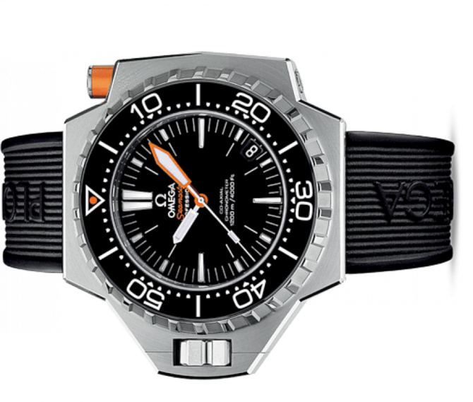 В модели Seamaster Ploprof 1200M, воздающей должное богатым традициям дайверских часов OMEGA, сочетаются легендарный дизайн и ультрасовременные технологии. Устойчивое к царапинам сапфировое стекло с двусторонним антибликовым покрытием надежно накрывает оригинальный циферблат. На ее черном циферблате выделяется окошко указателя даты в положении «4 часа 30 минут». Корпус размером 55 х 48 мм из нержавеющей стали c черным каучуковым ремешком дополнен вращающимся в обоих направлениях черным безелем с цифрами и дайверской шкалой с белым покрытием Super-Luminova, нанесенными со внутренней стороны сапфирового кольца. Часы OMEGA Seamaster Ploprof 1200M, оснащенные автоматическим гелиевым клапаном, завинчивающейся заводной головкой и кнопкой блокировки безеля. В этих профессиональных дайверских часах используется коаксиальный часовой механизм OMEGA, калибр 8500. Часы сохраняют водонепроницаемость на глубинах до 120 бар (1200 метров / 4000 футов). Запас хода механизма часов - 60 часов.