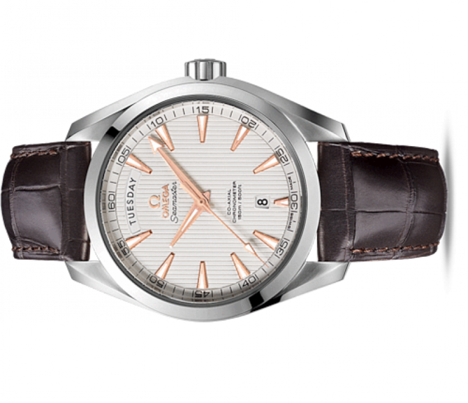 Эти высокопрочные часы классического дизайна воздают должное богатому морскому наследию OMEGA. Эффектный дизайн циферблата, характерный для коллекции OMEGA Seamaster Aqua Terra 150M. Модель данных часов имеет серебристый циферблат с узором из вертикальных полос (Teak Concept). Оригинальный циферблат защищен устойчивым к царапинам сапфировым стеклом с двусторонним антибликовым покрытием. Указатель дня недели находится в положении «12 часов», а указатель даты находится в положении «6 часов». Часы сохраняют свою водонепроницаемость до 15 бар (150 метров / 500 футов). Безель закреплен на стальном корпусе диаметром 41,5 мм с кожаным ремешком коричневого цвета. В этом сертифицированном хронометре используется коаксиальный часовой механизм OMEGA, калибр 8602, который хорошо виден сквозь прозрачную заднюю крышку корпуса. Запас хода данной модели - 55 часов.