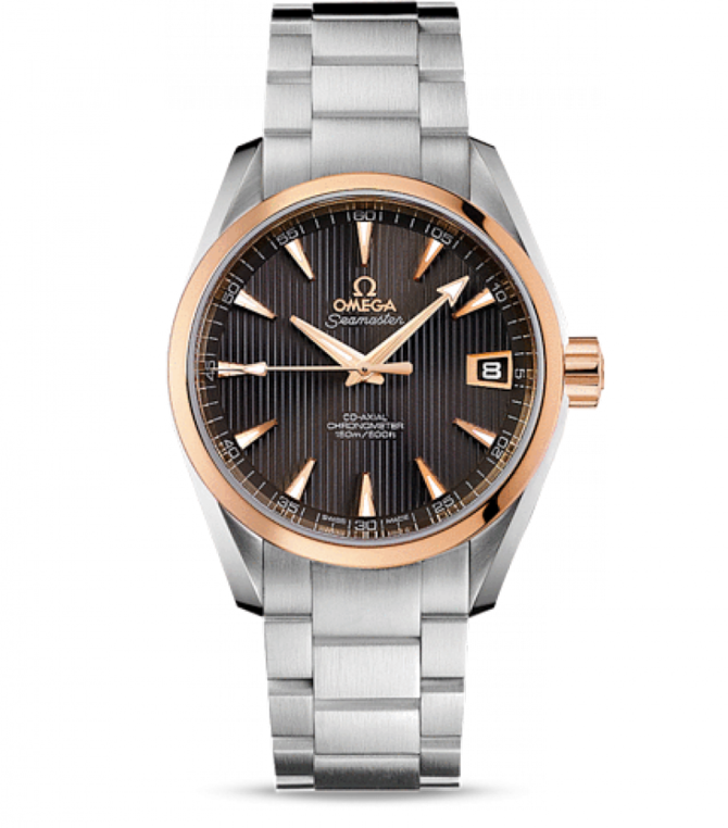 Эффектный, мгновенно узнаваемый дизайн циферблата, характерный для коллекции OMEGA Seamaster Aqua Terra 150M, напоминает текстуру тикового покрытия роскошных яхт. Оригинальный циферблат защищен устойчивым к царапинам сапфировым стеклом с двусторонним антибликовым покрытием. Данная модель имеет серый циферблат, оформленный в стиле фирменной «тиковой концепции», с окошком указателя даты в положении «3 часа». Корпус диаметром 38.5 мм из нержавеющей стали с стальным браслетом дополнен элегантным безелем с 18-каратного розового золота. Запас хода данного механизма - 60 часов. В этом сертифицированном хронометре используется коаксиальный часовой механизм OMEGA, калибр 8500, который хорошо виден через прозрачную заднюю крышку. Также часы водонепроницаемы и способны выдержать давление на глубине до 150 метров.