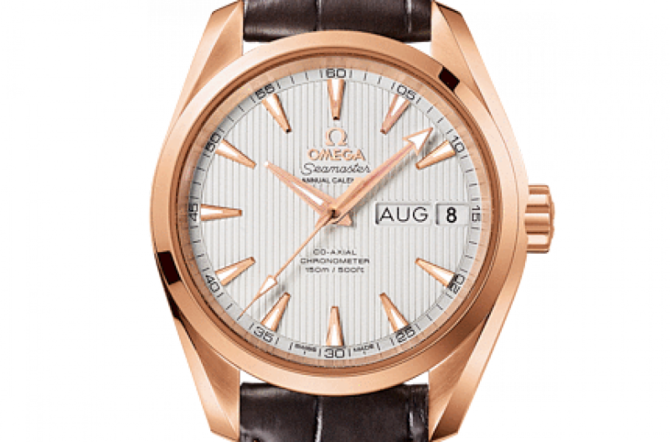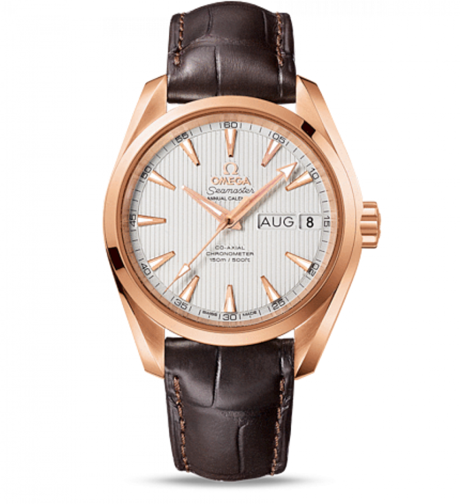 Дизайн циферблата, характерный для коллекции OMEGA Seamaster Aqua Terra 150M, напоминает тиковое покрытие роскошных яхт. Безель изготовлена из 18-каратного розового золота и расположена на корпусе диаметром 38.5 мм из того же материала, который дополнен коричневым ремешком из кожи алигатора. Оригинальный циферблат данной модели защищен устойчивым к царапинам сапфировым стеклом с двусторонним антибликовым покрытием. Данная модель имеет матовый серебристый циферблат с узором из вертикальных полос (Teak Concept). Окошка указателя месяца и даты расположены в положении «3 часа». В этих часах используется эксклюзивный коаксиальный часовой механизм OMEGA, калибр 8601. Часы сохраняют свою водонепроницаемость при давлении до 15 бар (150 метров / 500 футов). Запас хода часов - 55 часов.