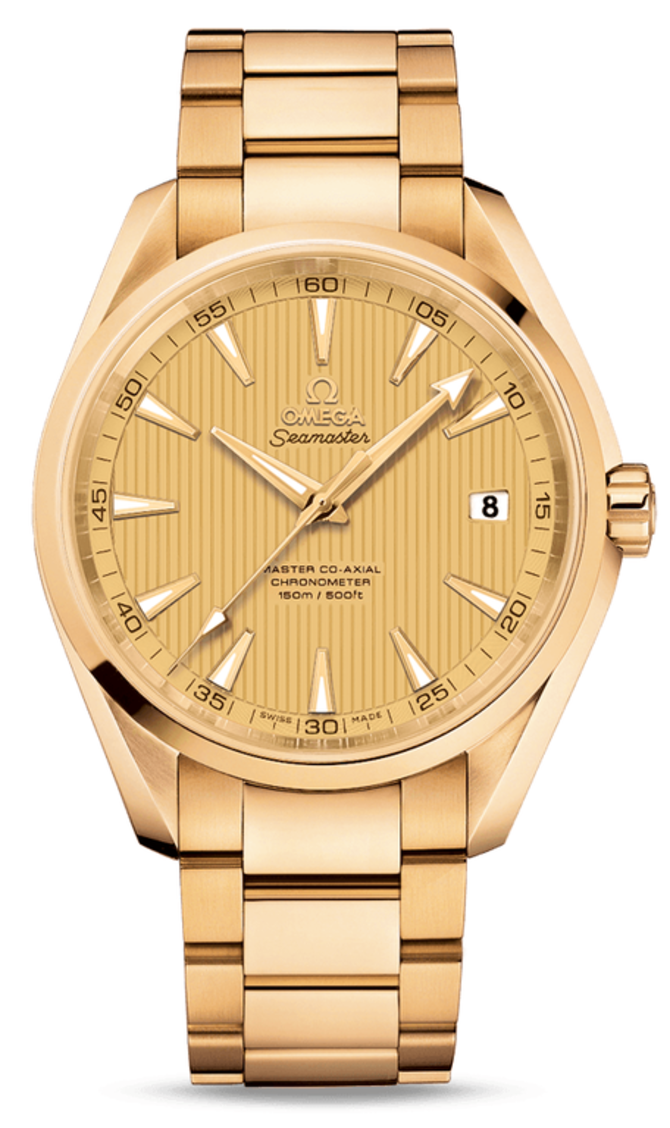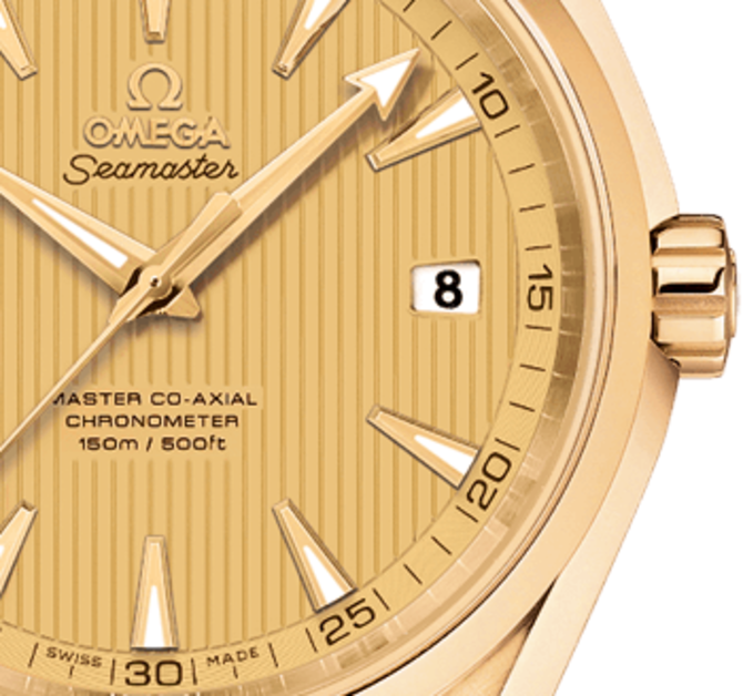 Швейцарские часы мужской коллекции Seamaster Agua Terra от OMEGA отличаются оригинальным узнаваемым дизайном. Особая отделка циферблата с вертикальными полосами напоминает тиковое покрытие роскошных яхт. В данной модели гильошированный циферблат выполнен в золотистом цвете и защищен от царапин сапфировым стеклом. На 3-часовой отметке расположен указатель даты. Часовые отметки и центральные стрелки изготовлены из 18-каратного желтого золота. Модель оснащена антимагнитным автоматическим механизмом с хронометрической точностью калибр 8501. Запас хода 60 часов. Корпус из 18-каратного желтого золота обеспечивает водонепроницаемость до 150 м. Часы комплектуются удобным браслетом из 18-каратного желтого золота.