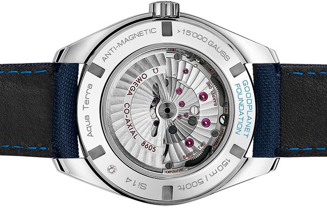 Швейцарские мужские часы OMEGA пользуются большим успехом благодаря гармоничному сочетанию дизайна и инновационному механизму. Фирма OMEGA сотрудничает с благотворительным фондом GoodPlanet. Поэтому часть средств от продажи модели Aqua Terra 150 m Goodplanet GMT будет направлена на защиту окружающей среды. Представленная модель оснащена механизмом OMEGA калибр 8605, который способен выдерживать магнитное поле силой более 15000 Гауссов. По этому показателю данный механизм опережает все аналоги, существующие сегодня на рынке. Решение было достигнуто путем использования комплектующих из материалов, не содержащих железа: самая чувствительная деталь механизма спираль - из запатентованного сплава Nivalgauss, пружина амортизаторов - из аморфного металла. За работой механизма можно наблюдать через прозрачную заднюю крышку из сапфирового стекла. Механизм с автоподзаводом и запасом хода 60 часов. Корпус хронометра обеспечивает механизму водонепроницаемость до 150 м. На белом циферблате расположены синие граненые центральные стрелки и часовые индексы, внутрення часть которых заполнена люминесцентным покрытием. Часы имеют стрелку GMT с острым наконечником, которая совершает полный оборот за 24 часа и показывает время во втором часовом поясе. Циферблат защищен сапфировым стеклом. Модель комплектуется текстильным ремешком темно-синего цвета с титановой вставкой.