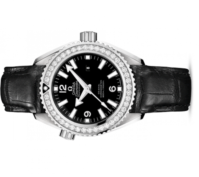 Стильная модель OMEGA Seamaster Planet Ocean 600M воздает дань историческим традициям дайверских часов OMEGA. Часы OMEGA Seamaster Planet Ocean 600M, оснащенные гелиевым клапаном. Они сохраняют водонепроницаемость на глубинах до 600 метров. Коаксиальный калибр OMEGA 8521, механическое сердце этих часов, хорошо виден через прозрачную заднюю крышку. Запас хода: 50 часов. Корпус диаметром 37,5 мм изготовлен из нержавеющей стали с черным кожаным ремешком. Безель украшенный бриллиантами и вращается в одном направлении. Часы имеют циферблат черного цвета который накрыт выпуклым сапфировым стеклом с антибликовым покрытием. Окошко указателя даты расположено в положении «3 часа».