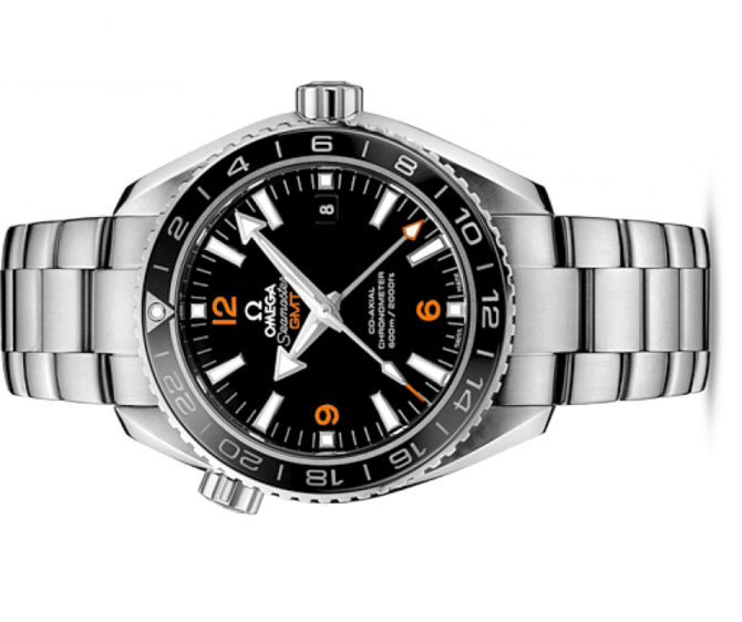 Стильная модель OMEGA Seamaster Planet Ocean 600M GMT отдает дань историческим традициям дайверских часов OMEGA. Часы OMEGA Seamaster Planet Ocean 600M GMT имеют гелиевый клапан и сохраняют водонепроницаемость до 60 бар (600 метров / 2000 футов). Коаксиальный калибр OMEGA 8605 этого сертифицированного хронометра виден сквозь прозрачную заднюю крышку корпуса. Полированный черный керамический безель вращается в обоих направлениях и закреплен на корпусе диаметром 43,5 мм из нержавеющей стали. Безель дополняет браслет из того же материала. Эта модель с устойчивым к царапинам сапфировым стеклом имеет черный лакированный циферблат с окошком даты в положении «3 часа» и центральной стрелкой GMT. Отметки часов "6", "9" и "12" выделены оранжевым цветом. Запас хода часов - 60 часов.