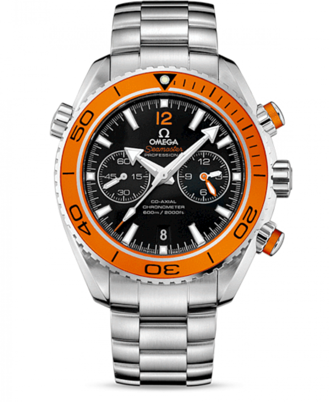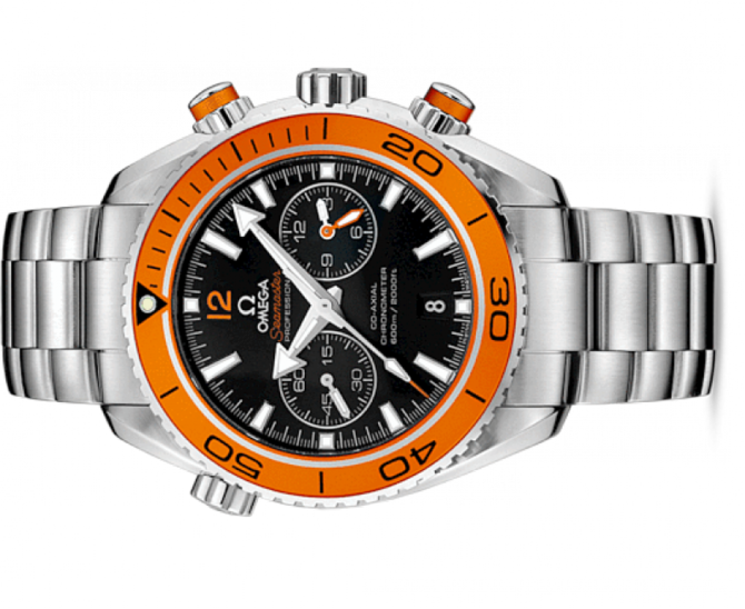 В 2005 году OMEGA выпустила линию Planet Ocean. Стильная модель OMEGA Seamaster Planet Ocean 600M воздает дань историческим традициям дайверских часов OMEGA. Корпус из нержавеющей стали диаметром 45,5 мм с браслетом из того же материала дополнен оранжевым керамическим дайверским безелем, который вращается в одном направлении. Черный циферблат имеет отдельный индикатор малой секундной стрелки, окошко указателя даты в положении «6 часов» и центральная стрелка хронографа. 60-минутный и 12-часовой счетчики размещены на одном индикаторе в положении «3 часа», что обеспечивает понятную индикацию прошедшего с начала отсчета времени. В этом сертифицированном хронометре используется коаксиальный часовой механизм OMEGA, калибр 9300, который хорошо виден через прозрачную заднюю крышку. Запас хода которого составляет 60 часов. Часы OMEGA Seamaster Planet Ocean 600M, оснащенные гелиевым клапаном. Он сохраняют водонепроницаемость на глубинах до 600 метров.