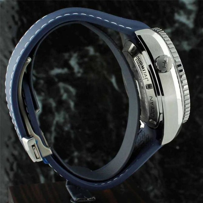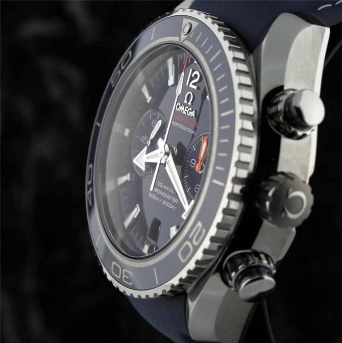Одна из моделей новой коллекции Planet Ocean Collection удивляет необычным миксом новых материалов. Ее корпус размером 45.5 мм сделан из титана. Это значит, что очень легкий элемент соединен в сплаве с небольшим количеством алюминия и ванадия, что делает его чрезвычайно прочным. Титан с показателем прочности 5 можно отполировать и он будет сиять ярче других титановых сплавов. Часы оснащены ярким синим керамическим безелем, чья шкала и цифры сделаны из сплава на базе циркония, который называется Liquidmetal. Omega стала первой мануфактурой, которая использует смесь керамики и сплава Liquidmetal. В 2009 году представила ограниченную серию Seamaster с черным керамическим циферблатом и этим уникальным сплавом. Сочетания синей керамики и Liquidmetal в новой модели Planet Ocean – новая мировая премьера. Новинка оснащена синим лакированным циферблатом. Необычные часы представлены на синем интегрированном каучуковом ремешке, который идеально сочетается с синим керамическим безелем. Доступна также модель с титановым браслетом. Seamaster Planet Ocean 45.50 mm Titanium Liquidmetal Chronograph оснащен коаксиальным Калибром 9300, первым механизмом с хронографом в семье мануфактурных Калибров Omega. Механизм оснащен кремниевой пружиной баланса, на все часы распространяется полная гарантия в течение 4-х лет. Калибр: Omega 9300 Автоподзавод, хронограф с колонным колесом, коаксиальный спуск для неизменной точности и долговечности механизма, свободно колеблющийся кремниевый регулятор баланс-спираль, 2 последовательно включенных заводных барабана, двустороннее вращение инерционного сектора для ускорения подзавода, родиевое покрытие, эксклюзивный декор "Женевские волны". Запас хода 60 часов.