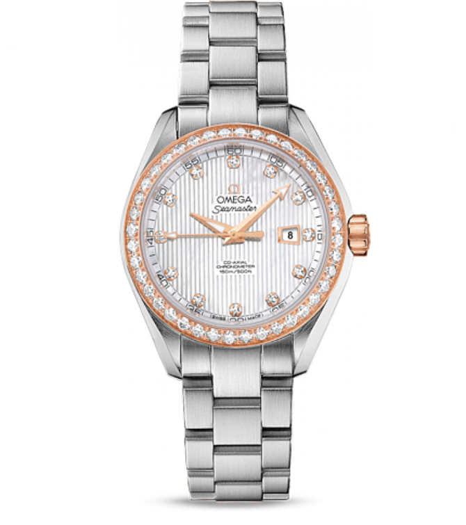Часы с классическим дизайном воздают должное богатому морскому наследию OMEGA. Дизайн циферблата, характерный для коллекции OMEGA Seamaster Aqua Terra 150M, напоминает текстуру тикового покрытия роскошных яхт. Циферблат защищен устойчивым к царапинам сапфировым стеклом с двусторонним антибликовым покрытием. Корпус диаметром 34 мм из нержавеющей стали с стальным браслетом дополнен элегантным безелем 18-каратного розового золота, который украшен бриллиантами. Данная модель имеет белый перламутровый циферблат с бриллиантовыми часовыми метками, оформленный в стиле фирменной «тиковой концепции», с окошком указателя даты в положении «3 часа». В этом сертифицированном хронометре используется коаксиальный часовой механизм OMEGA, калибр 8521, который хорошо виден через прозрачную заднюю крышку. Запас хода данного механизма - 50 часов. Также часы водонепроницаемы и способны выдержать давление на глубине до 150 метров.