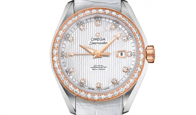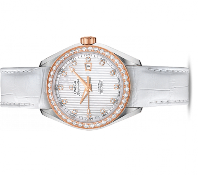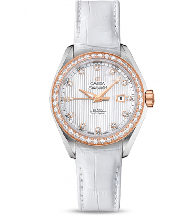 Эффектный и узнаваемый дизайн циферблата, характерный для коллекции OMEGA Seamaster Aqua Terra 150M, напоминает текстуру тикового покрытия роскошных яхт. В этом сертифицированном хронометре используется коаксиальный часовой механизм OMEGA, калибр 8521, который хорошо виден через прозрачную заднюю крышку. Также часы водонепроницаемы и способны выдержать давление на глубине до 150 метров. Запас хода данного механизма - 50 часов. Данная модель имеет белый перламутровый циферблат с бриллиантовыми часовыми метками, оформленный в стиле фирменной «тиковой концепции», с окошком указателя даты в положении «3 часа». Оригинальный циферблат защищен устойчивым к царапинам сапфировым стеклом с двусторонним антибликовым покрытием. Корпус диаметром 34 мм из нержавеющей стали с белым ремешком из крокодильей кожи дополнен элегантным безелем 18-каратного розового золота, который украшен бриллиантами.