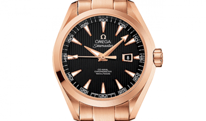 Высокопрочные часы с классическим дизайном воздают должное богатому морскому наследию OMEGA. Мгновенно узнаваемый дизайн циферблата, характерный для коллекции OMEGA Seamaster Aqua Terra 150M, напоминает текстуру тикового покрытия роскошных яхт. Циферблат защищен устойчивым к царапинам сапфировым стеклом с двусторонним антибликовым покрытием. Данная модель имеет черный циферблат, оформленный в стиле фирменной «тиковой концепции», с окошком указателя даты в положении «3 часа». В этом сертифицированном хронометре используется коаксиальный часовой механизм OMEGA, калибр 8521, который хорошо виден через прозрачную заднюю крышку. Запас хода данного механизма - 50 часов. Корпус диаметром 34 мм из 18-каратного розового золота и браслетом из тогоже материала дополнен элегантным безелем из 18-каратного розового золота. Часы водонепроницаемы и способны выдержать давление на глубине до 150 метров.