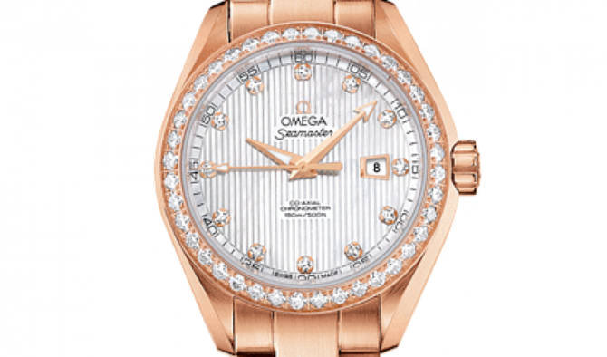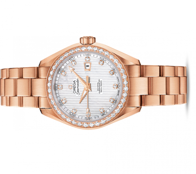Эффектный, мгновенно узнаваемый дизайн циферблата, характерный для коллекции OMEGA Seamaster Aqua Terra 150M, напоминает текстуру тикового покрытия роскошных яхт. В этом сертифицированном хронометре используется коаксиальный часовой механизм OMEGA, калибр 8521, который хорошо виден через прозрачную заднюю крышку. Запас хода данного механизма - 50 часов. Часы имеют белый перламутровый циферблат с бриллиантовыми часовыми метками, оформленный в стиле фирменной «тиковой концепции», с окошком указателя даты в положении «3 часа». Оригинальный циферблат защищен устойчивым к царапинам сапфировым стеклом с двусторонним антибликовым покрытием. Корпус диаметром 34 мм из 18-каратного розового золота с браслетом из того же материала дополнен элегантным безелем из 18-каратного розового золота. Часы водонепроницаемы и способны выдержать давление на глубине до 150 метров.