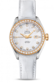 Мгновенно узнаваемый дизайн циферблата, характерный для коллекции OMEGA Seamaster Aqua Terra 150M, напоминает текстуру тикового покрытия роскошных яхт. Корпус диаметром 34 мм из 18-каратного розового золота с белым ремешком из кожи аллигатора дополнен элегантным безелем из 18-каратного розового золота. В этом сертифицированном хронометре используется коаксиальный часовой механизм OMEGA, калибр 8521, который хорошо виден через прозрачную заднюю крышку. Оригинальный циферблат защищен устойчивым к царапинам сапфировым стеклом с двусторонним антибликовым покрытием. Часы имеют белый перламутровый циферблат с бриллиантовыми часовыми метками, оформленный в стиле фирменной «тиковой концепции», с окошком указателя даты в положении «3 часа». Запас хода данного механизма - 50 часов. Часы водонепроницаемы и способны выдержать давление на глубине до 150 метров.
