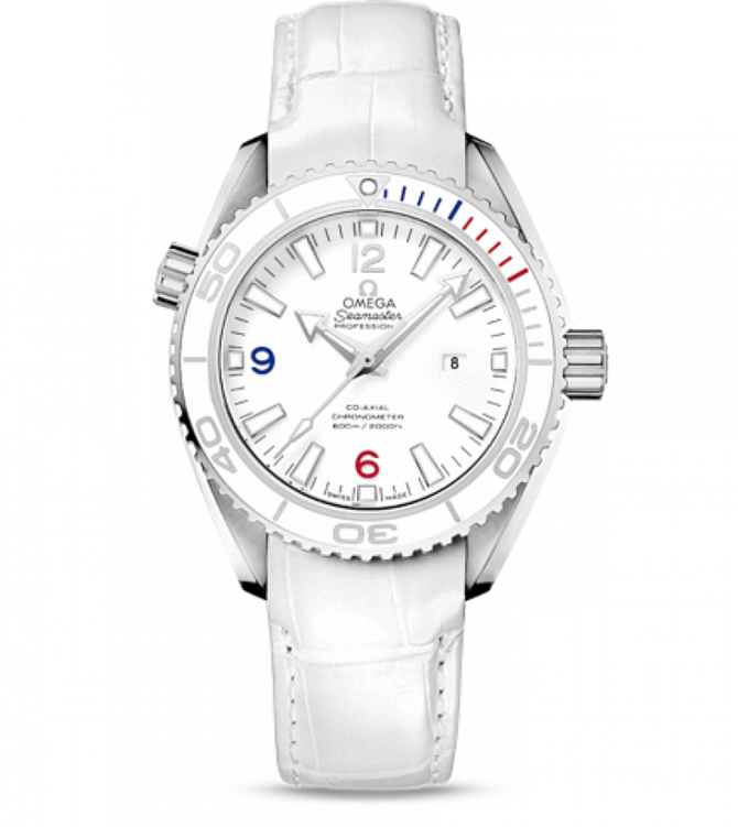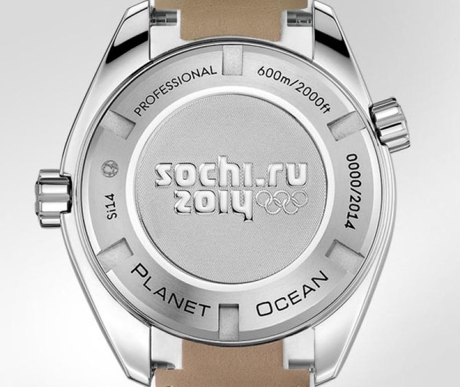 Развивая тему морского наследия бренда, в 2005 году OMEGA выпустила линию Planet Ocean. Стильные часы OMEGA Seamaster Planet Ocean 600M воздают должное не только историческим традициям дайверских часов OMEGA, но и зимним Олимпийским играм 2014 года в Сочи. На их белом циферблате, защищенном устойчивым к царапинам сапфировым стеклом, выделяется окошко указателя даты в положении «3 часа». Корпус диаметром 37,5 мм из нержавеющей стали с белым кожаным ремешком дополнен белым керамическим дайверским безелем, вращающимся в одном направлении. Поскольку дизайн часов навеян цветами флага Российской Федерации, на циферблате и дайверской шкале присутствуют элементы красного и синего цвета. Часы OMEGA Seamaster Planet Ocean 600M, оснащенные гелиевым клапаном, сохраняют водонепроницаемость на глубинах до 60 бар (600 метров / 2000 футов). Часы выпускаются ограниченной серией из 2 014 экземпляров. Основу этой модели составляет коаксиальный часовой механизм OMEGA, калибр 8520. Запас хода данных часов - 50 часов.