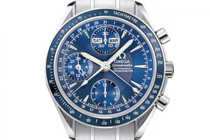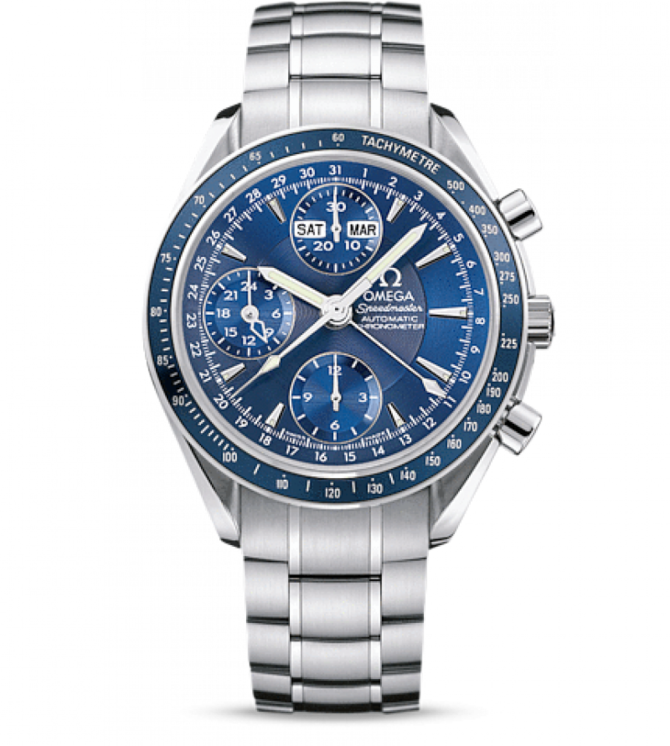 Побывав во всех шести лунных экспедициях, легендарные часы Speedmaster стали впечатляющим символом, выражающим первопроходческий дух марки OMEGA. Синий безель с тахиметрической шкалой закреплен на корпусе диаметром 40 мм из нержавеющей стали. Часы дополняет браслет из нержавеющей стали. Основу этих часов составляет механический калибр OMEGA 3606 с хронографом. Запас хода часового механизма этой модели - 44 часа. Часы сохраняют свою водонепроницаемость на глубине до 100 метров. Данная модель имеет черный циферблат с шкалой указателя даты. Малая секундная стрелка находится на одном вспомогательном циферблате с 24-часовой стрелкой; на вспомогательном циферблате 30-минутного счетчика в положении «12 часов» имеются окошки указателей дня недели и месяца. В центре находятся следующие стрелки: часовая и минутная, секундная стрелка хронографа, стрелка указателя даты. Еще один вспомогательный циферблат предназначен для 12-часового счетчика. Эффектный циферблат надежно накрыт устойчивым к царапинам сапфировым стеклом.