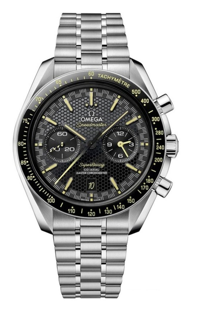 Швейцарские мануфактуные часы от компании Omega - Speedmaster Super Racing Co-Axial Master Chronometer Chronograph, представлены в корпусе, размером 44.25 x 14.9 мм, из нержавеющей стали с водонепроницаемостью 50 метров. Внутри корпуса установлен автоматический механизм 9920 с запасом хода 60 часов, функцией хронографа и статусом хронометрической точности хода. На черном циферблате отображаются часы, минуты, секунды, дата, тахиметр, хронограф. Часы поставляются на браслете из нержавеющей стали с раскладной пряжкой. Корпус с двух сторон закрыт сапфировым стеклом с антибликовым покрытием. Часовые метки и стрелки покрыты люминесцентным составом, светящимся в темноте. Часы выпущены в 2023 году.