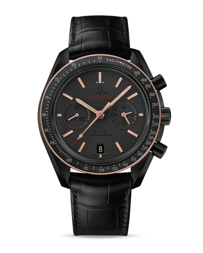 Швейцарские механические наручные часы от легендарной часовой мануфактуры Omega представлены в круглом 44-миллиметровом керамическом корпусе с вставками из розового золота. Внутри корпуса инженеры мануфактуры разместили механический механизм с функцией хронографа, функционирующий от автоматического подзавода и обладающий 42-часовым запасом хода (Калибр Omega 9300). Стоит отметить, что часовой механизм модели отмечен официальным сертификатом C.O.S.C (швейцарский институт хронометрии) в качестве хронометра. На черном циферблате отображаются часы, минуты, секунды и дата, а на безель нанесена тахиметрическая шкала. Часовые стрелки, индексы и безель с нанесением люминесцентного покрытия Super-LumiNova. Корпус герметичен до 50 метров глубины. В комплекте идет ремешок из натуральной кожи аллигатора с фирменной керамической классической застежкой от Omega.