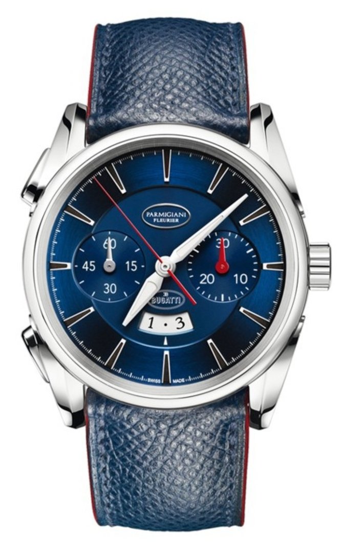 Комбинированный корпус из белого золота и титана прячет в своем основании мануфактурный механический калибр VC Caliber 2260/1 с функциями автоподзавода и хронографа. БрендParmigiani этим произведением часового искусства пополнил коллекцию Bugatti. Синий циферблат, на котором указываются часы, минуты, секунды, дата и хронограф, накрыт стеклом из сапфира. Механизм VC Caliber 2260/1 обладает запасом хода в 50 часов. Задняя крышка сделана из сапфирового стекла, открывающего вид на механизм. К часам в комплекте идет ремешок из кожи крокодила синего цвета и раскладывающаяся застежка. Стрелки родиевые. Водостойкость - 30 метров. На задней крышке гравировкой нанесен индивидуальный номер часов.