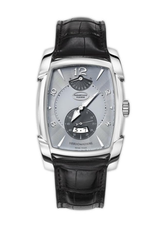 Часовая швейцарская элитная мануфактура Parmigiani Fleurier пополнила коллекцию "Kalpa" механическими наручными часами в, традиционном для коллекции, бочкообразном корпусе, изготовленном из палладия. Корпус имеет такие параметры: 53.00 x 37.20 - диаметр; 11.20 мм - толщина. На элегантном циферблате, с ярко выраженными индикаторами, указываются часы, минуты, секунды, дата и уровень запаса хода мануфактурного швейцарского механизма с ручным подзаводом, установленного мастерами бренда Parmigiani Fleurier внутри роскошного корпуса. Сапфировое стекло гарантирует надежную защиту циферблата модели "Hebdomadaire". Ремешок, которым укомплектованы представленные швейцарские часы Parmigiani Fleurier, пошит из натуральной кожи аллигатора. Дополнением к нему является классическая застежка из палладия. Владелец этой модели может рассчитывать на 30-метровую герметичность корпуса.