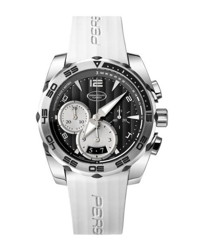 Толщина корпуса из нержавеющей стали - 13.10 мм; диаметр - 42.00 мм. Сапфировое стекло защищает циферблат от разнообразных повреждений. Водостойкость корпуса не высокая - 30 метров. К данной модели полагается каучуковый ремешок белого цвета с раскладной стальной застежкой. Массивный круглый 42-миллиметровый корпус данных швейцарских часов служит убежищем для мануфактурного часового механизма с хронографом собственной разработки компании Parmigiani Fleurier. Механизм в действие приводит ротор автоподзавода. Швейцарский механизм гарантирует индикацию на черном циферблате данных часов, минут, секунд, даты и счетчиков хронографа. Все часы марки Parmigiani Fleurier производятся в более чем легендарной долине Флерье, расположенной в Швейцарии. Сама компания была основана не так давно, в 1990-ом году. Однако ее основатель, Мишель Пармиджиани, уже на тот момент имел 25-летний опыт реставрации старинных часов.